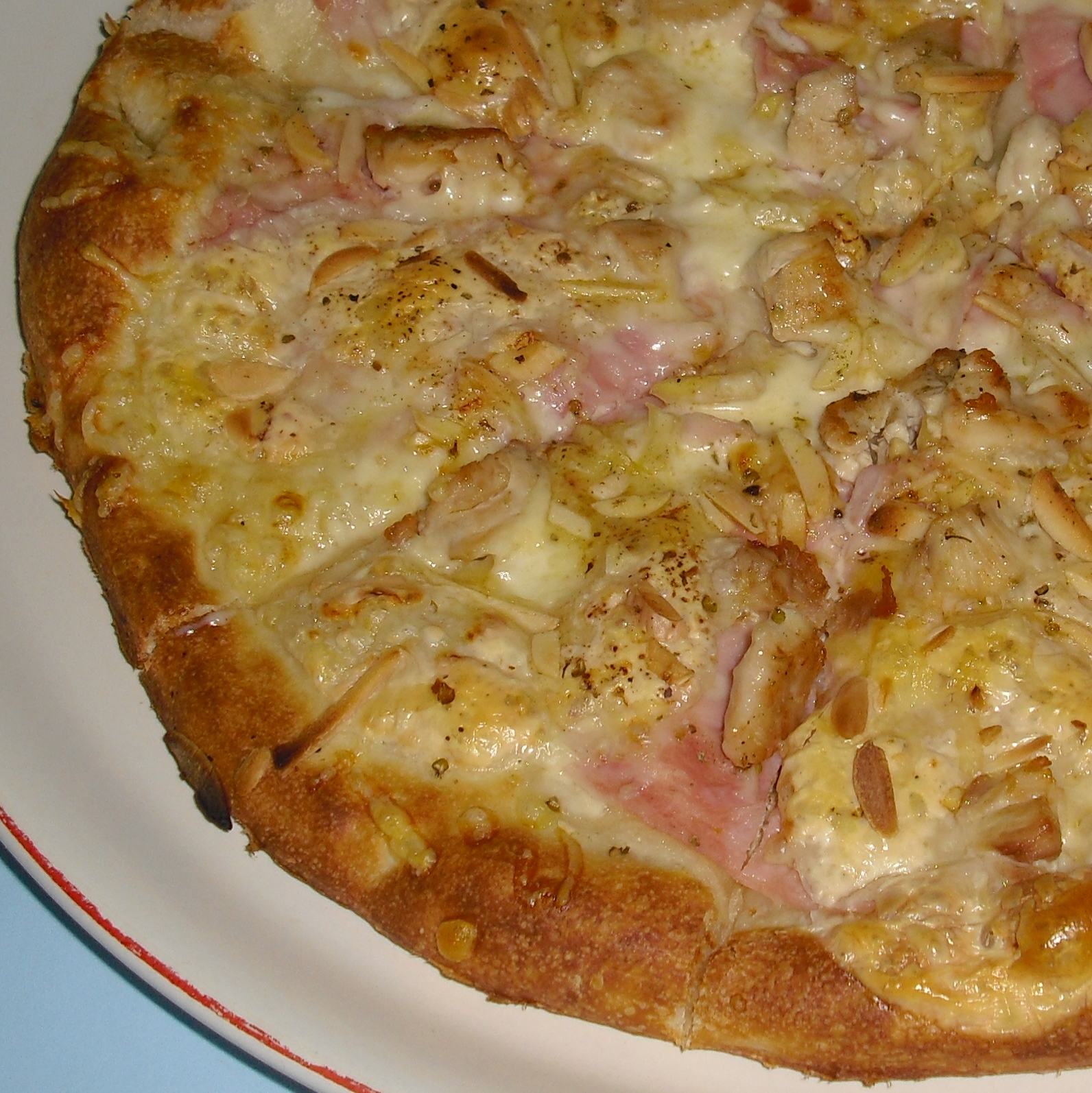 37. Pizza s mandlemi (smetana,šunka,kuř.maso,mandle,mozzarella,sýr) 22 cm