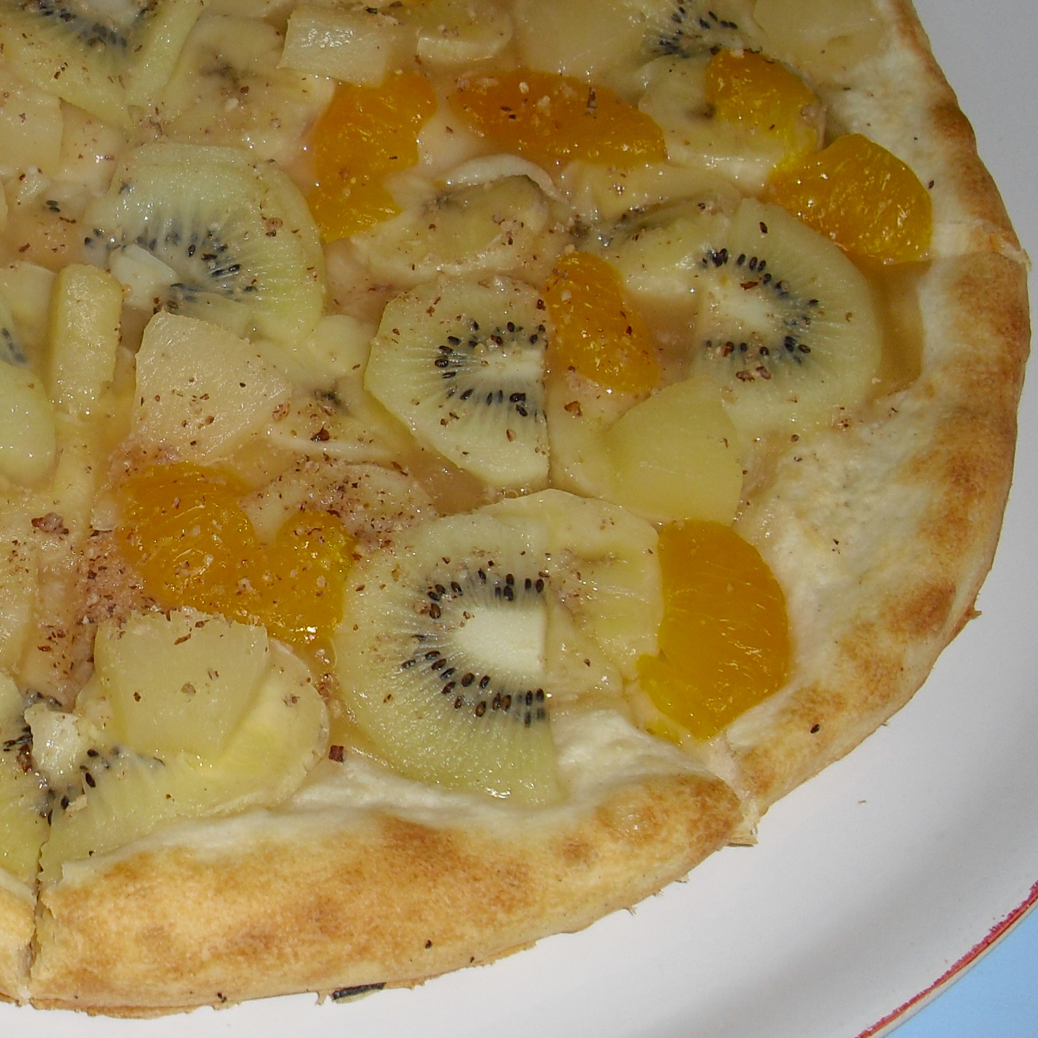 19. Pizza exotická ovocná(jablkové pyré,kiwi,ananas,mandarinky,banán,ořechy)43cm