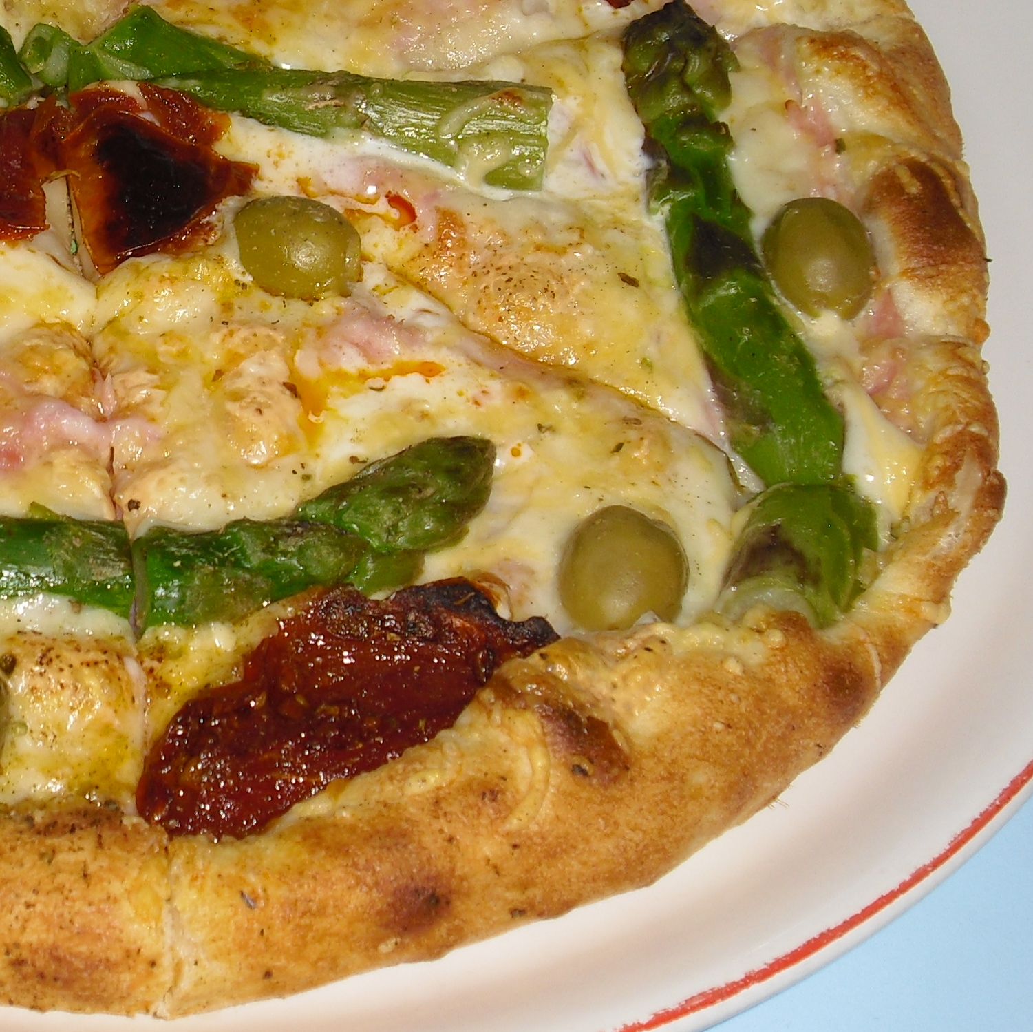 - 44. Pizza s chřestem (smet.,šunka,suš.rajč.,chřest,olivy,mozzarella,sýr) 43 cm