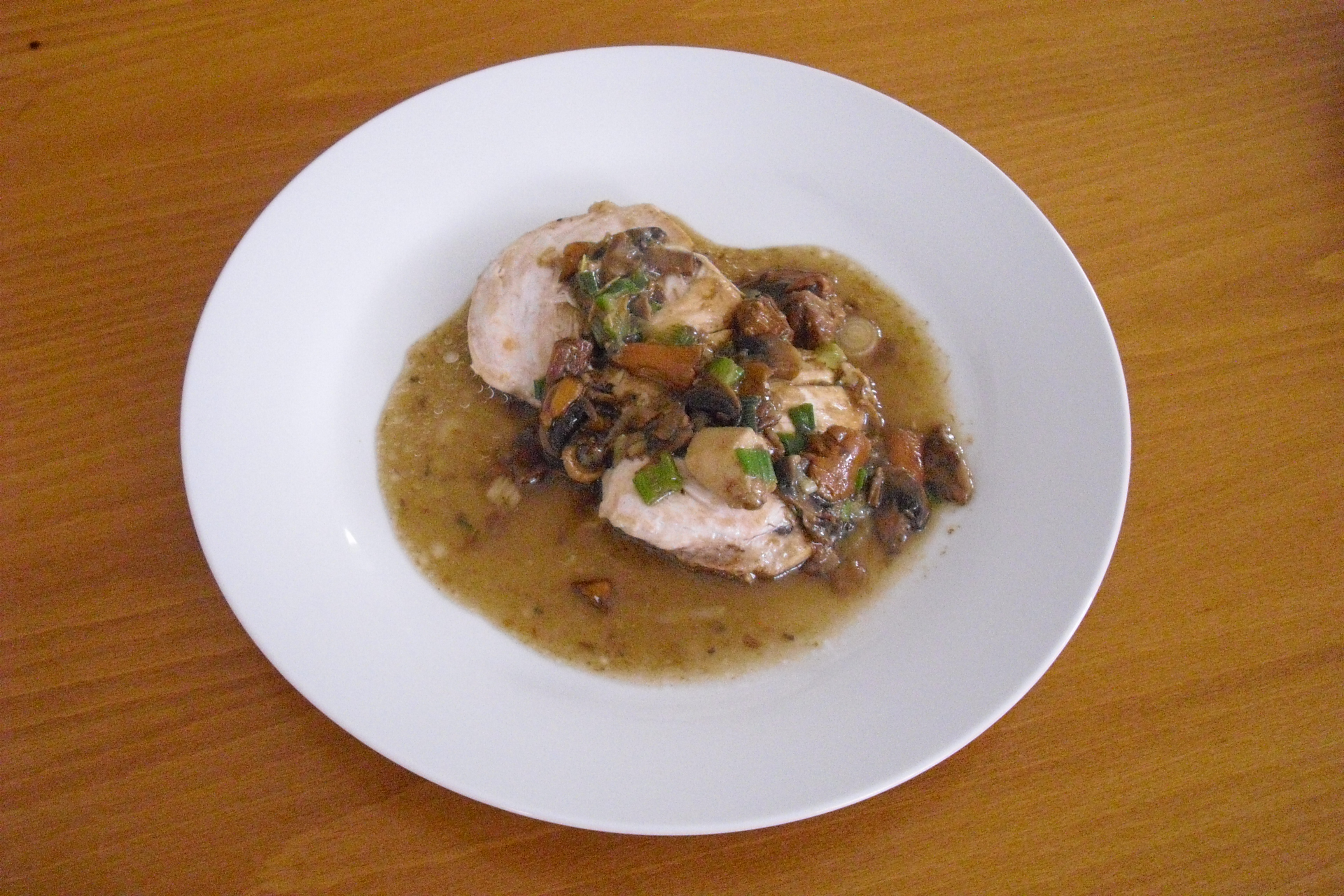 Steak s houbovým ragů (prso, žampion,hříbky,lišky,jarní cibulka)