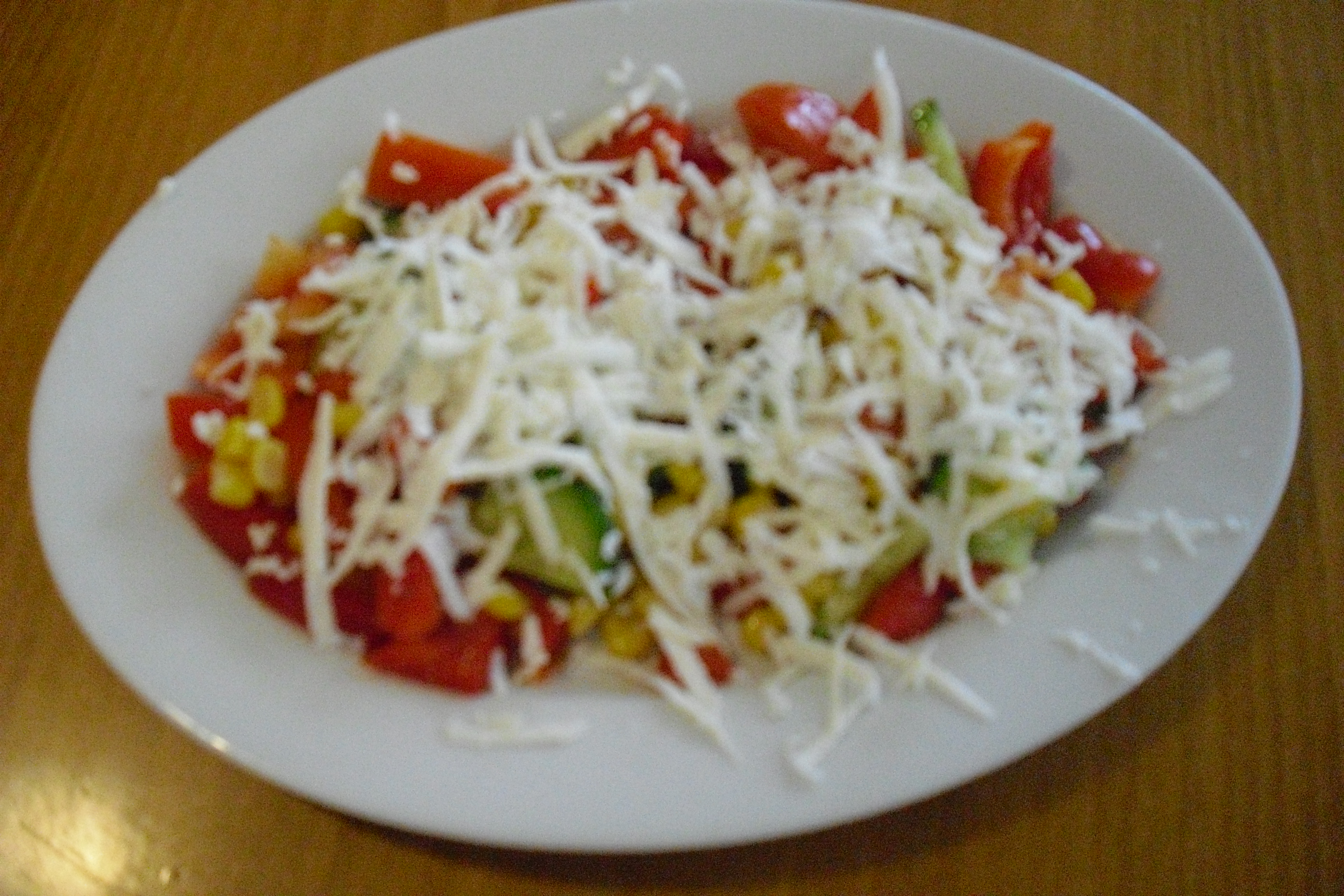Míchaný salát s kukuřicí (rajče,okurka,paprika,kukuřice,balkánský sýr)