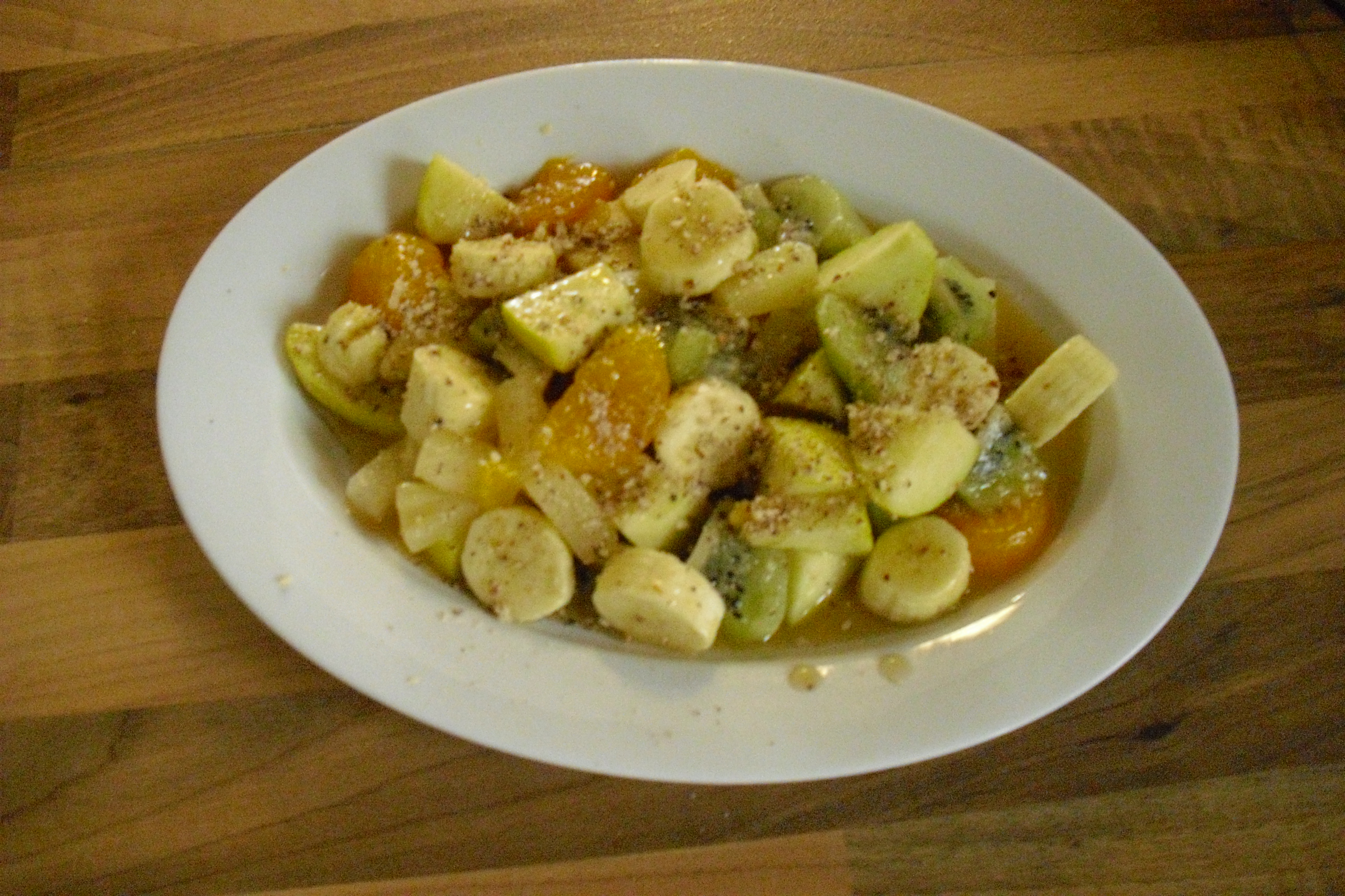 Ovocný salát (ananas,mandarinky,banán,jablko,kiwi,karamel)