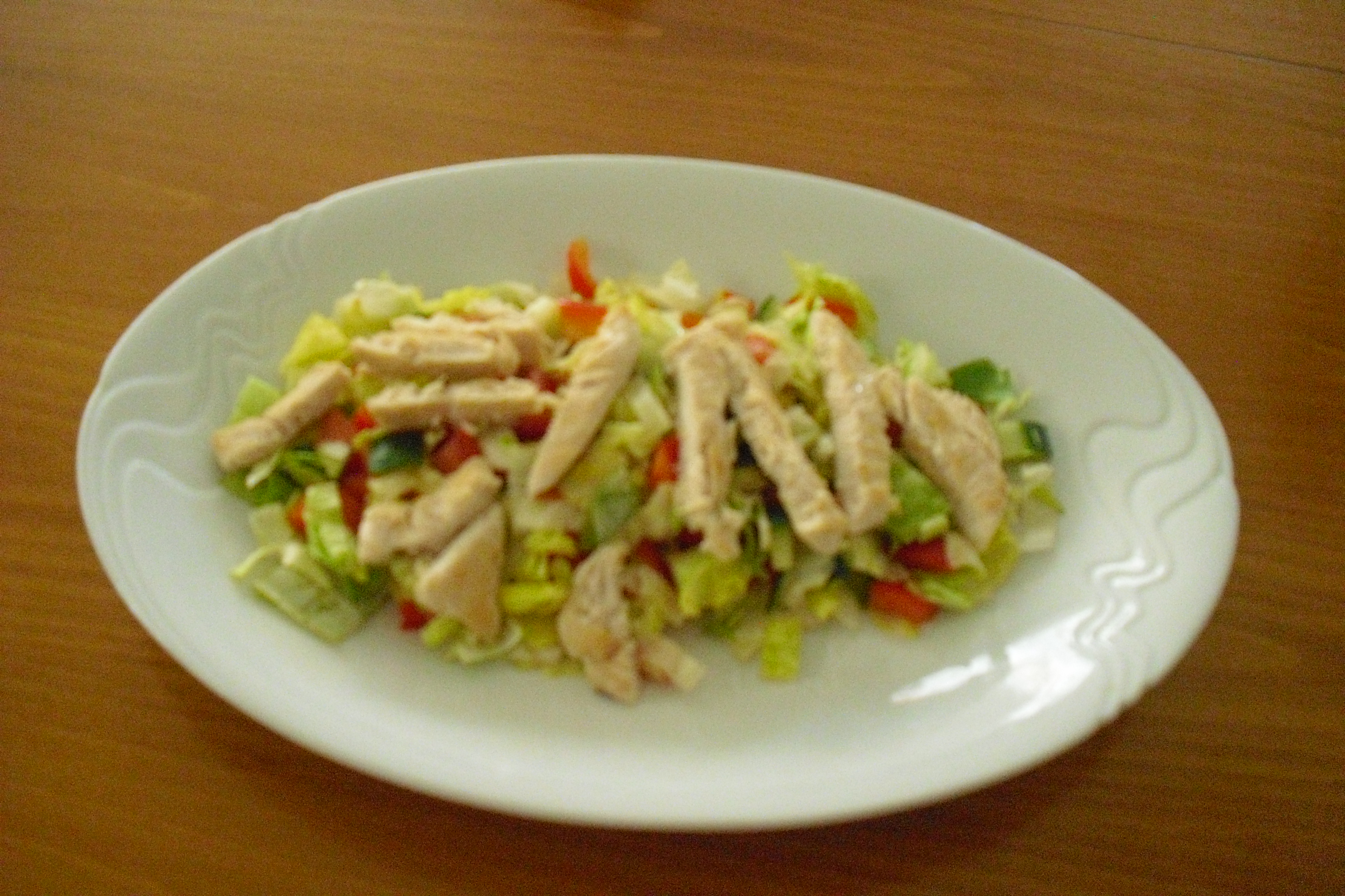 (ledový salát, paprika, rajče, okurka, pórek, dresing, kuřecí maso-120g)